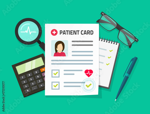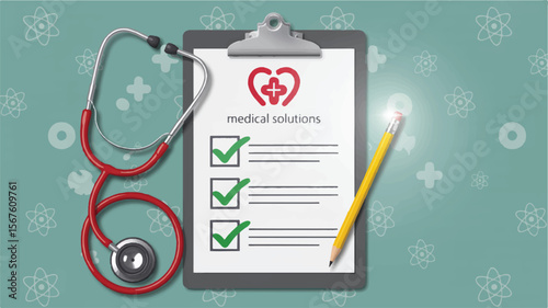 Векторная иллюстрация концепции формы медицинского страхования. Заполнение медицинских документов. Стетоскоп, шприц.