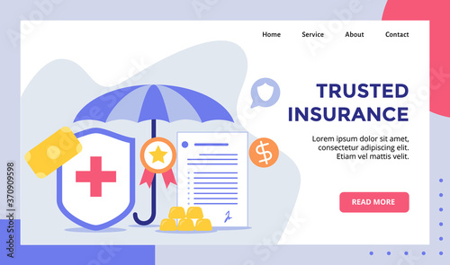 Векторный шаблон веб-сайта медицинского страхования, дизайн веб-страницы и целевой страницы для разработки веб-сайтов и мобильных сайтов. Люди, полис медицинского страхования, щит под зонтиком.