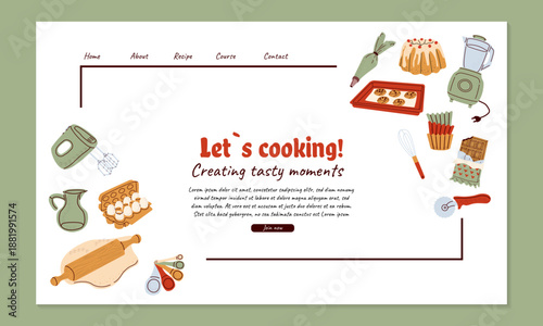 Векторный шаблон веб-сайта Food online, дизайн целевой страницы для веб-сайта и разработки мобильных веб-сайтов. Заказ здоровой органической пищи. Овсяная каша с бананом, клубникой, яблоками на завтрак.