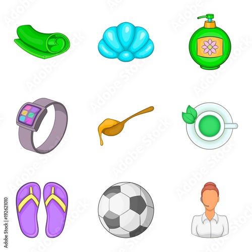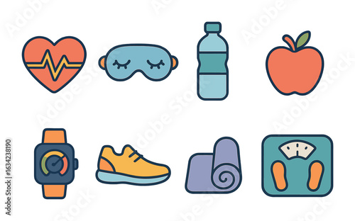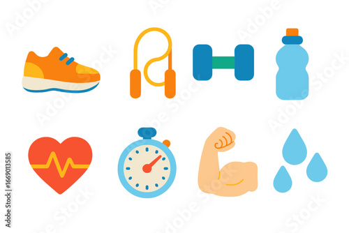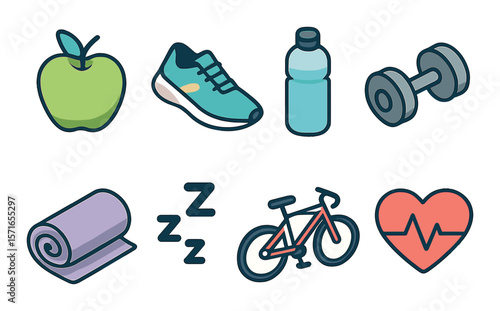 Векторный плакат о здоровом образе жизни. Оборудование для фитнеса, материалы и аксессуары для спортивных тренировок, иллюстрация диетических продуктов питания