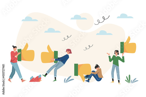 Огромный стакан свежего органического фруктового смузи с черникой, бананом и кубиками льда, микроперсонажи готовят и пьют коктейль, векторная иллюстрация. Концепция здорового завтрака или перекуса для страницы веб-сайта