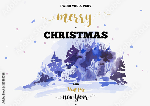 Типография рукописных надписей Hello Winter card, векторная иллюстрация в стиле бумажного искусства. Красивая вырезанная из бумаги зимняя композиция со снежными елками, елочными шарами и силуэтом зайца.