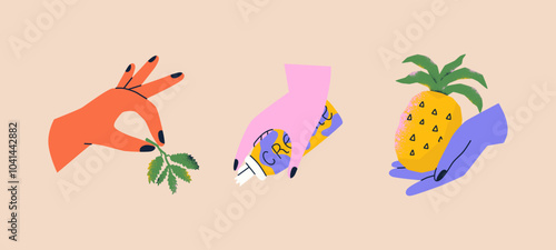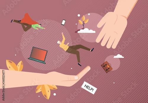 Человеческие руки и супермен, помогающий бизнесмену не упасть, векторная плоская иллюстрация. Метафора протянуть руку помощи, поддержки людям, находящимся в состоянии стресса, депрессии и т.д.