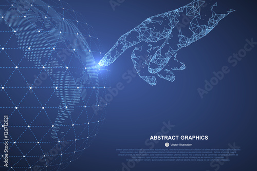 Векторная многоугольная художественная рука в стиле человеческой руки. Низкополигональная каркасная сетка с рассеянными частицами и световыми эффектами на темно-синем фоне. Шаблон дизайна баннера концептуального плаката "Рука помощи" с пространством для копирования.