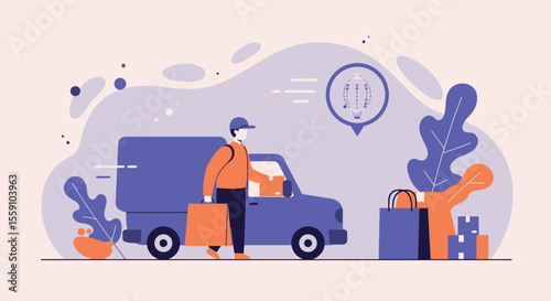Мужские персонажи курят косяк, загружая грузовик для доставки конопли медицинскими таблетками в капсулах с марихуаной, векторная иллюстрация. Доставка каннабиса, концепция потребления марихуаны для веб-баннера, страницы веб-сайта и т.д.