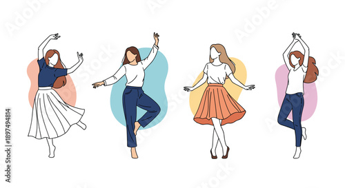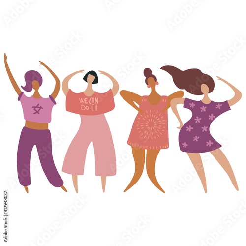 Сцена празднования девичника. Невеста в свадебном платье и группа подружек танцуют под музыку, развлекаясь векторной иллюстрацией. Концепция подготовки к церемонии бракосочетания