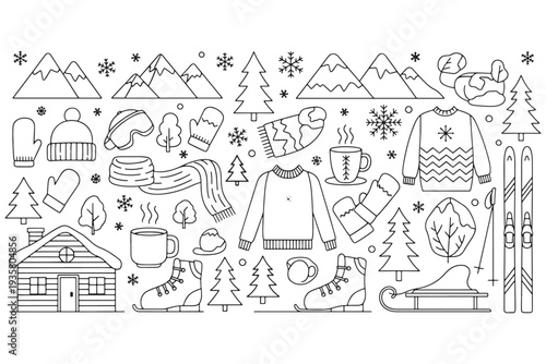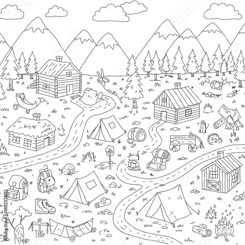 Векторная иллюстрация концепции похода. Современный элемент дизайна в стиле thin line art flat в форме треккингового ботинка с туристическими символами, значками для баннеров веб-сайтов и печатных материалов.