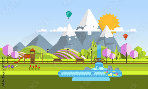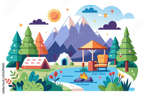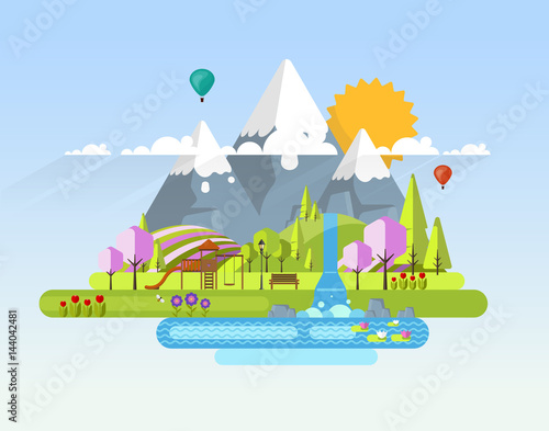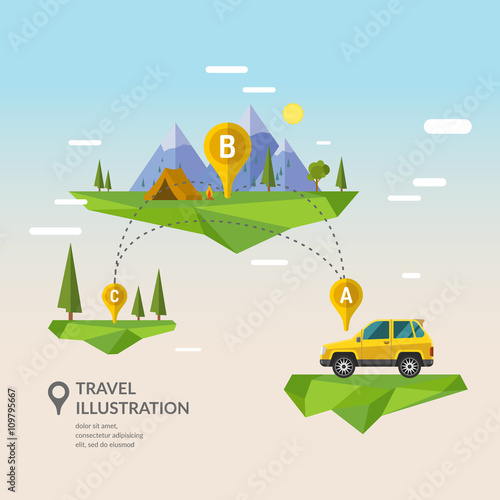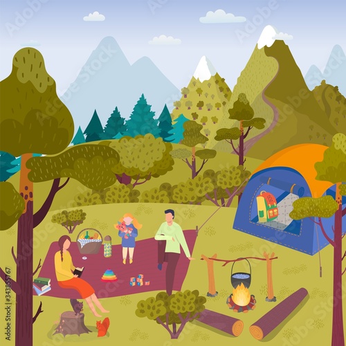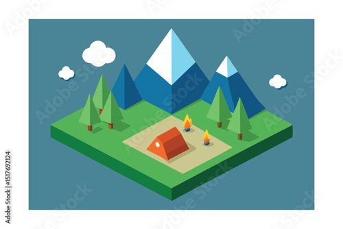 Прогулка по парку с изометрическими объектами на экране мобильного телефона. Векторная иллюстрация в плоском 3d-стиле. Активный отдых в горном лесу. Оставайтесь онлайн везде, где есть концептуальная иллюстрация.