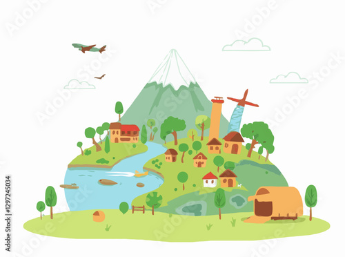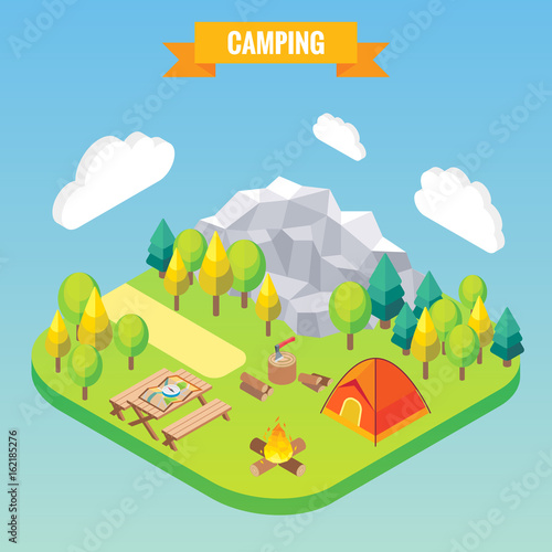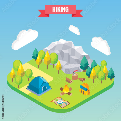 Пеший поход по горному лесу изометрическая концепция. Векторная иллюстрация в плоском 3d-стиле. Активный отдых на свежем воздухе.