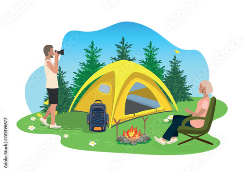 Сцена пешего туризма, плоская векторная иллюстрация. Мужской персонаж-турист, сидящий у палатки и костра. Афроамериканский путешественник, отдыхающий в кемпинге, пеший туризм. Треккинг, летний туризм, приключения, экспедиции.