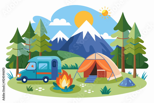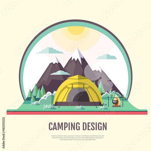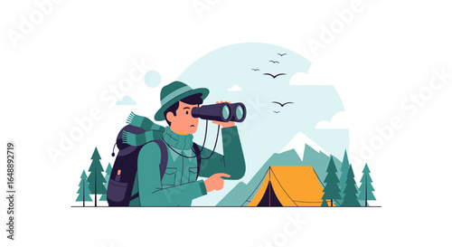 Сцена пешего туризма, плоская векторная иллюстрация. Путешественница, женский персонаж-путешественница, сидящая у костра с чашкой горячего чая. Треккинг, природный туризм, приключения, экспедиции, кемпинг.