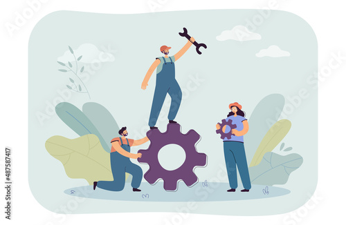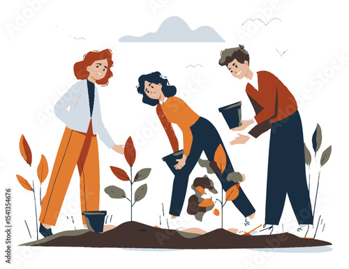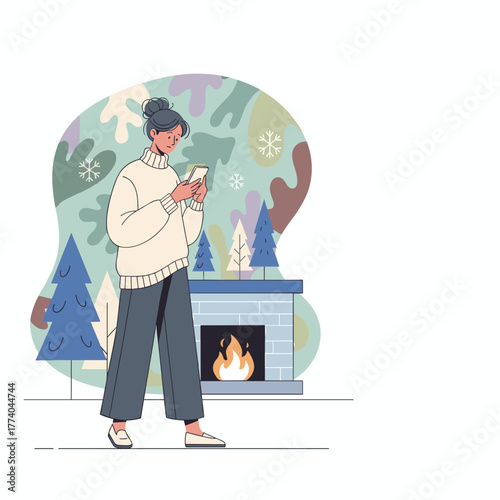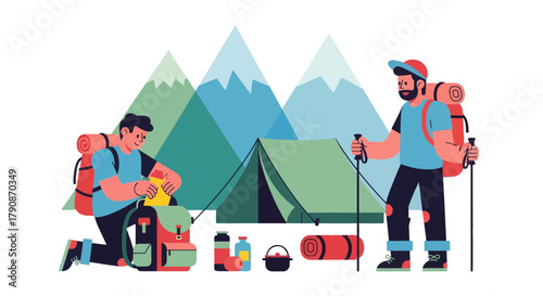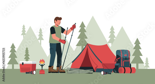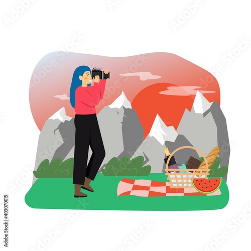 Сцена пешего туризма, плоская векторная иллюстрация. Путешественница, женский персонаж-турист, фотографирующий закат с помощью камеры. Треккинг, природный туризм, кемпинг, фотография.