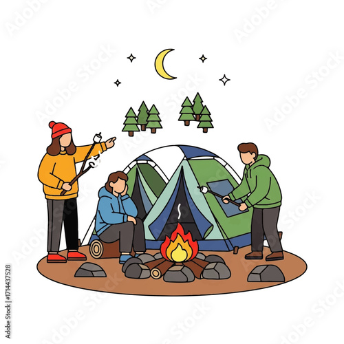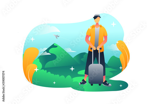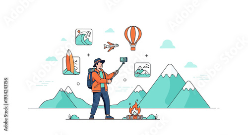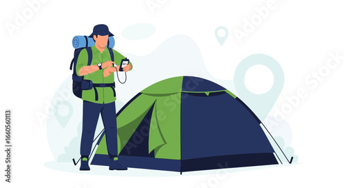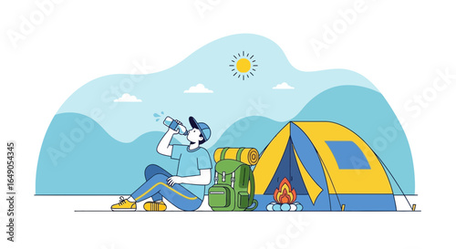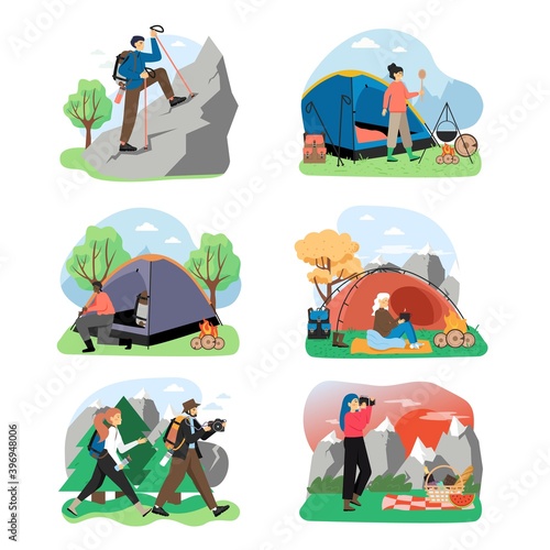 Съемочная площадка для пешего туризма. Плоские путешественники и пешие туристы в горной векторной иллюстрации. Приключения на каникулах и путешествия летом. Время отдыха в кемпинге