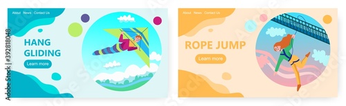 Хинг глайдер летит в небе. Женщина прыгает на тарзанке с моста. Иллюстрация векторной концепции экстремального спорта. Дельта-скольжение, банджи-джампинг, риск. Шаблон дизайна веб-сайта.