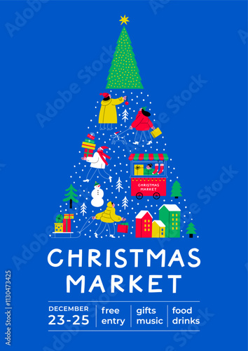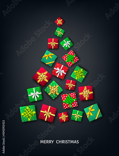 Шаблон праздничной Рождественской и новогодней открытки. Векторный плакат с нарисованными от руки символами. Подарочные коробки образуют рождественскую елку.