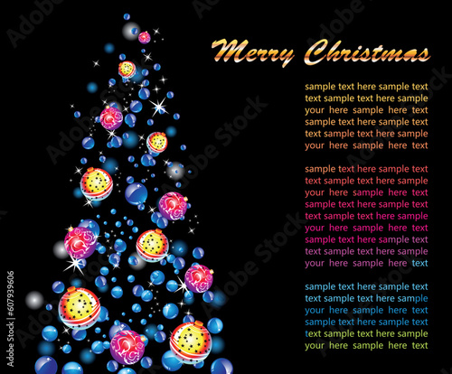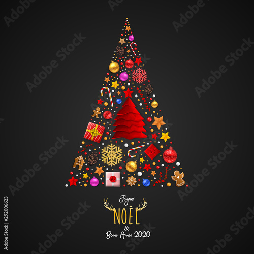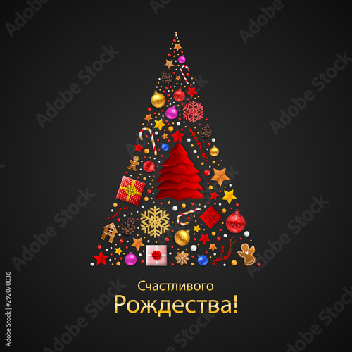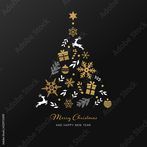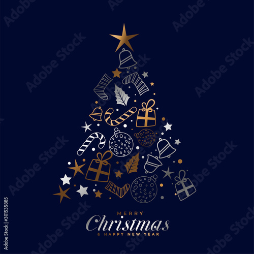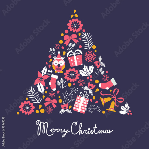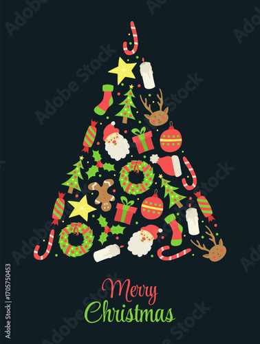 Шаблон праздничной Рождественской и новогодней открытки. Векторный плакат с нарисованными от руки символами. Подарочные коробки образуют рождественскую елку