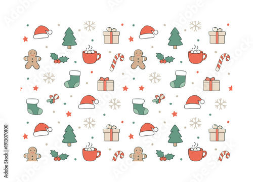 Праздничный Рождественский и новогодний бесшовный узор. Векторная иллюстрация оберточной бумаги в линейном стиле дизайна. Графические иконки с элементами игрушек и подарков.
