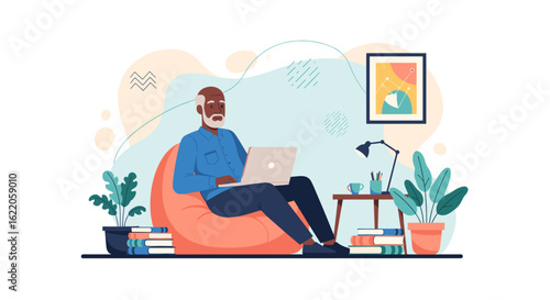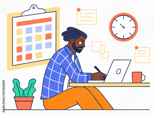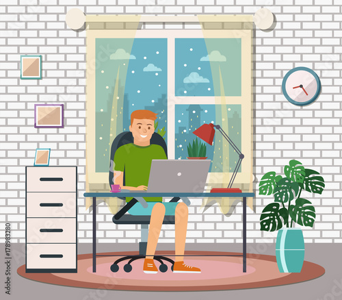 Ремонт домашней квартиры и вектор ремонта дома. Онлайн-сервис. Профессиональный мастер по ремонту работает над проектом интерьера квартиры. Мультяшный экран компьютера с иллюстрацией конструктора или строителя