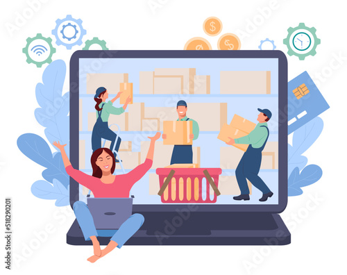 Кухня и бытовая техника онлайн-продажа, векторная иллюстрация. Концепция электронной коммерции, композиция онлайн-покупок с микро-персонажами, покупающими бытовую технику, телевизоры, чайник из огромного компьютерного магазина.