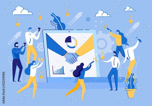 Иллюстрация векторной концепции продажи бытовой техники. Огромный телевизор и холодильник, а также микро-персонажи покупателей и продавщицы.