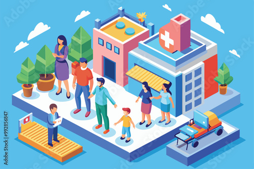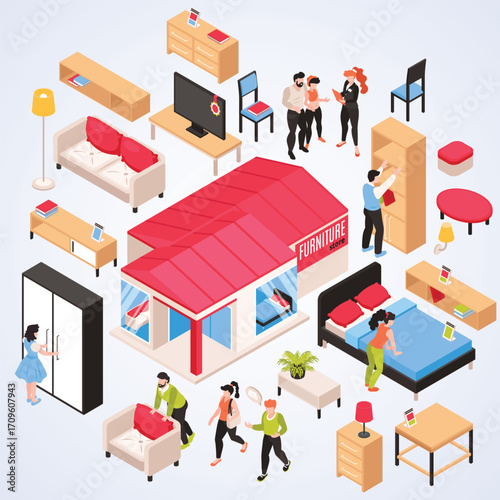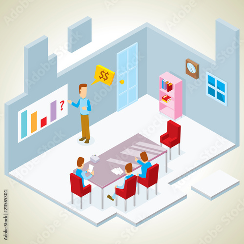 Домашний аукцион, векторная иллюстрация. Изометрическое здание жилого дома, аукционист с молотком и люди с веслами для ставок. Композиция аукциона и торгов для веб-баннера, страницы веб-сайта и т.д.