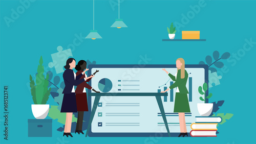 Сцена уборки дома, плоская векторная иллюстрация. Профессиональные персонажи-уборщики, выполняющие домашнюю работу. Люди убирают ванную и стирают одежду. Уборка номеров, услуги прачечной.