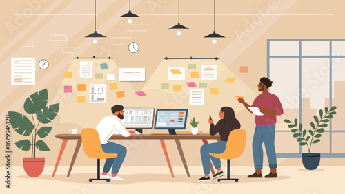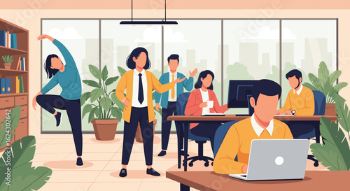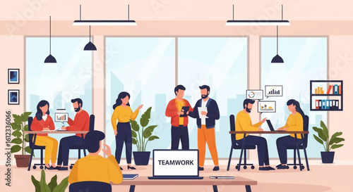 Сцена уборки дома, плоская векторная иллюстрация. Люди убирают зал. Профессиональные персонажи-уборщики, выполняющие домашнюю работу, моющие окна, полы, пылесосящие мебель. Услуги по уборке номеров.