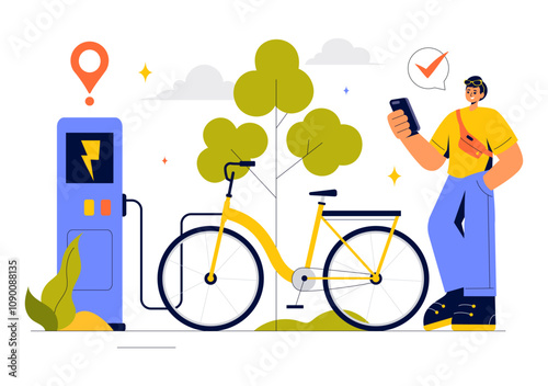 Молодой человек-курьер, доставляющий посылку к двери женщины на велосипеде, векторная иллюстрация дизайна в плоском стиле. Велосипедный курьер, концепция службы доставки на дом для плаката, баннера и т.д.