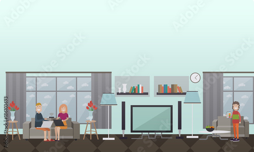 Векторная иллюстрация людей, использующих ноутбуки, цифровые планшеты для социальных сетей, покупок в Интернете, чтения новостей и т.д. дома. Интерьер гостиной. Концепция домашней сети Wi-Fi. Дизайн в плоском стиле.