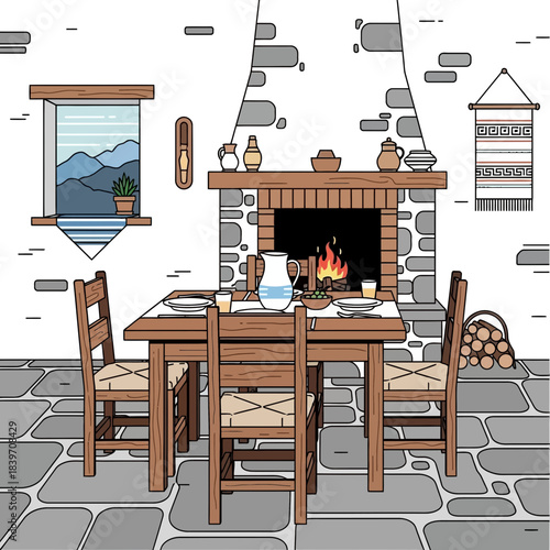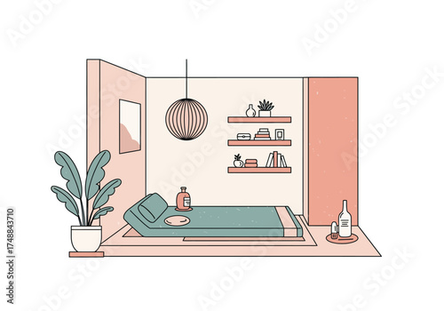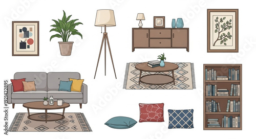 Современный дизайн интерьера дома. Интерьер гостиной рисованная векторная иллюстрация. Уютная мебель и аксессуары для комнат. Шкаф для хранения, настенная роспись, книжная полка и журнальный столик.