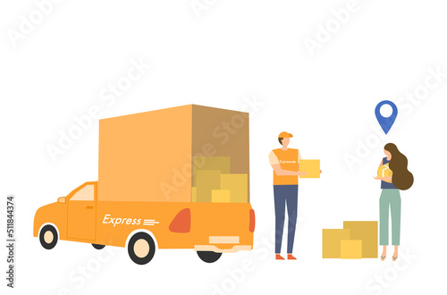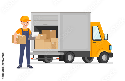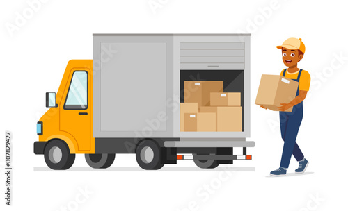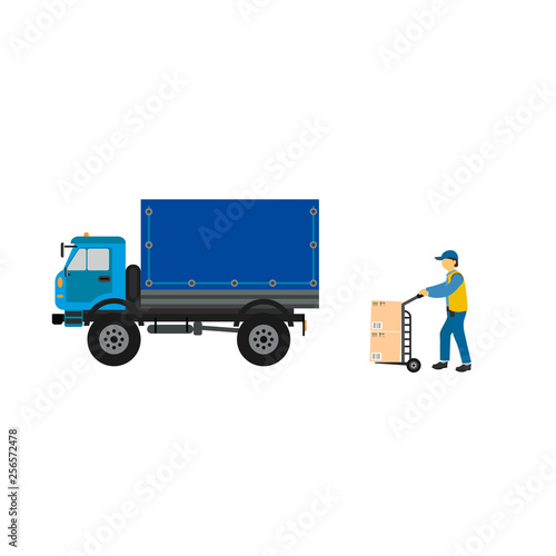 Набор для перемещения дома, плоская векторная изолированная иллюстрация. Грузовик доставки, рабочие, грузчики, грузчики, перевозящие картонные коробки, диван, собирающие мебель. Услуги компании по переезду и доставке.