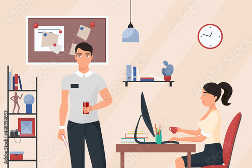 Услуги по ремонту и благоустройству дома, плоская векторная иллюстрация. Художник рисует стену. Дизайнер домашнего интерьера помогает клиенту выбрать цвета краски для стен онлайн.