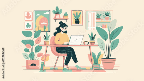 Школьница смотрит видео урок, сидя за столом перед ноутбуком, векторная плоская иллюстрация. Домашнее обучение или надомное воспитание. Дистанционное обучение во время карантина по коронавирусу.