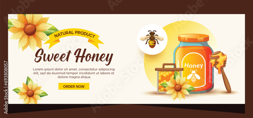 Вырезанный из бумаги горшочек для меда с реалистичной упаковкой клеверного меда в стеклянные банки на витрине внутри, векторная иллюстрация. Натуральный сладкий сироп, шаблон рекламы органического здорового питания.