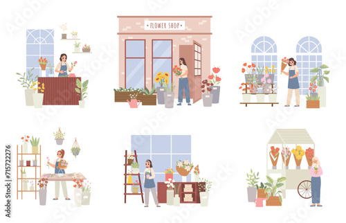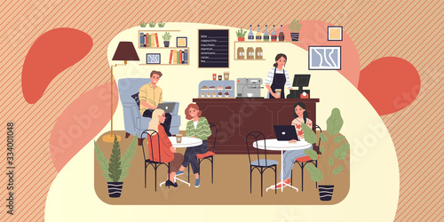 Набор общежитий, плоская векторная иллюстрация, изолированная на белом фоне. Здание хостела, стойка регистрации, кафе, запирающиеся шкафчики, душ, прачечная, кровать, туристическая пара, девушка, работающая на ноутбуке.