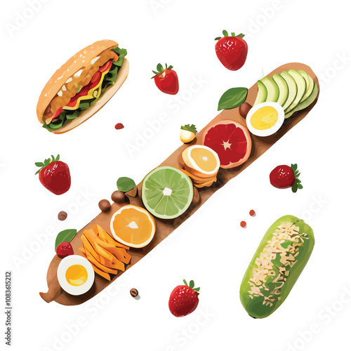Хот-дог и набор его ингредиентов, векторная иллюстрация, изолированная на белом фоне. Реалистичная колбаса, булочка для хот-дога, листья салата, помидор, огурец, лук, ломтики перца, горчица и кетчуп. Быстрое питание