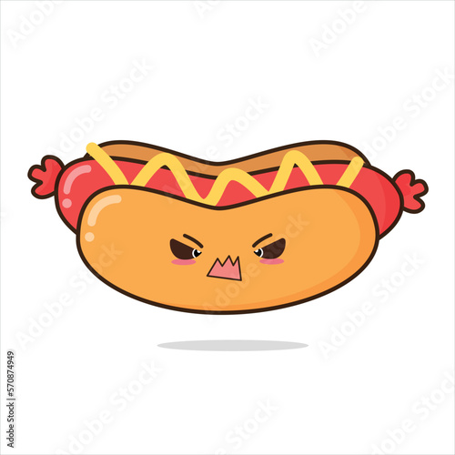 Вектор мультяшного персонажа хот-дога. Забавная булочка с колбасой, кетчупом и горчицей, выделенная на белом фоне. Симпатичный значок фаст-фуда
