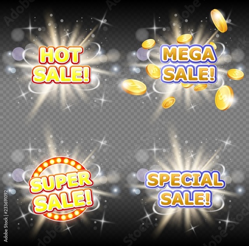 Горячий мега супер и специальный набор баннеров для распродажи. Векторная иллюстрация. Вывески распродаж и скидок на прозрачном фоне.