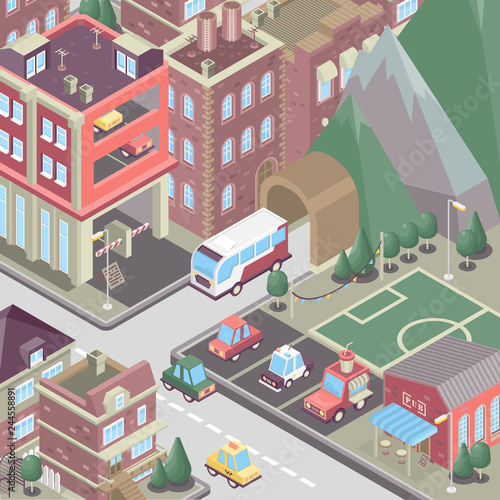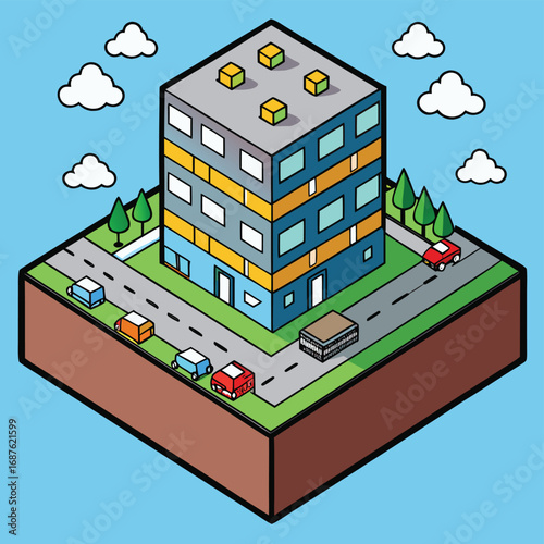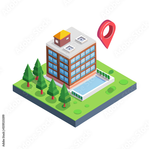 Здание отеля на экране мобильного телефона в векторном изометрическом стиле. Бронирование отеля онлайн с помощью смартфона. Иллюстрация в плоском 3d-дизайне. Изолированный элемент здания гостиницы.