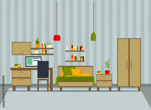 Векторная иллюстрация уборки номеров в отеле. Горничная застилает постель в гостиничном номере. Услуги носильщика в отеле, уборка номеров элементы дизайна в стиле квартиры.