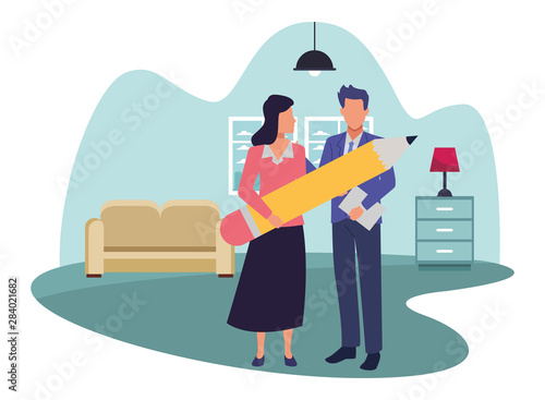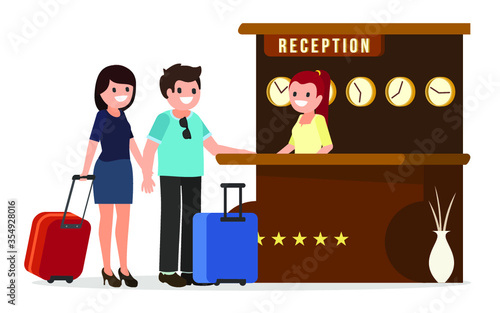 Векторная иллюстрация портье отеля, несущего чемоданы женщины-клиента. Элемент дизайна в стиле отеля people flat, значок, выделенный на белом фоне.