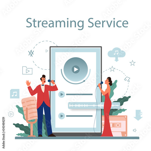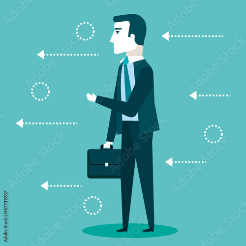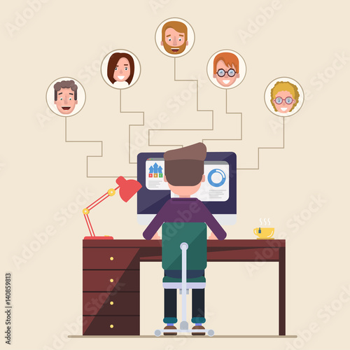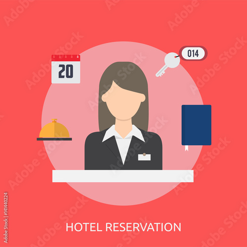 Векторная иллюстрация концепции стойки регистрации отеля. Работник отеля, администратор, мужчина, стоящий за стойкой регистрации и разговаривающий по телефону, элемент дизайна в плоском стиле.