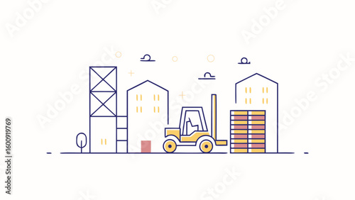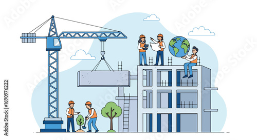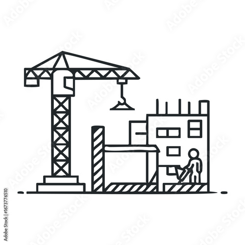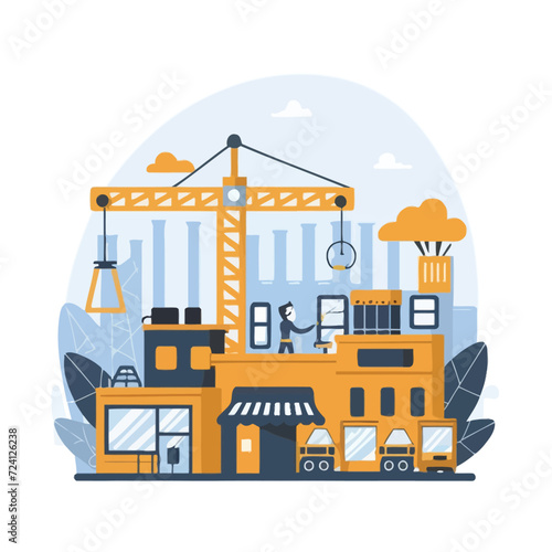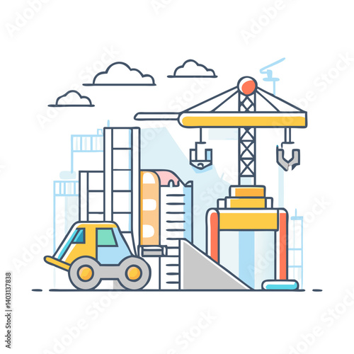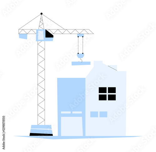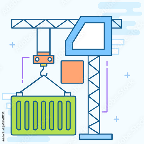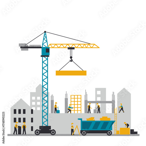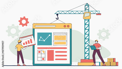 Векторная иллюстрация панели мониторинга деловой активности в строительстве зданий с башенным краном с графиками статистики. Концепция создания дома для веб-баннера, страницы веб-сайта, презентации и т.д.