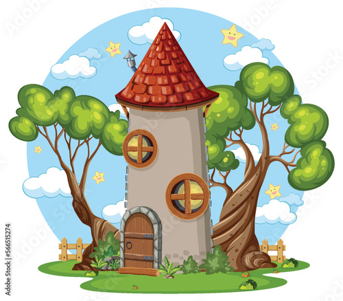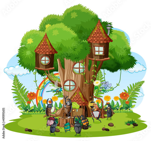 Дом на дереве. Пейзаж детской площадки. Векторные дети играют в парке с домиком на дереве и качелями. Детский сад, школьный огород или летний лагерь на открытом воздухе