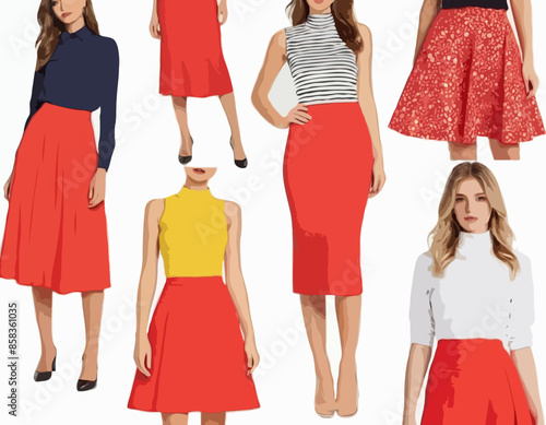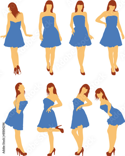 Коллекция из семи силуэтов молодых женщин, одетых в неформальном домашнем стиле. Платье домохозяйки, фартук, разные позы. Векторное изображение в плоском стиле.
