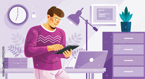 Человек, работающий по дому, вытирает пыль векторной иконкой, изолированной на белом фоне