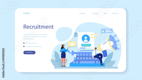 Шаблон веб-сайта целевой страницы управления персоналом. Векторная иллюстрация людей-работодателей, ищущих талантливых кандидатов на работу. Рекрутинг для бизнеса, услуги агентства по трудоустройству, концепция человеческих ресурсов.