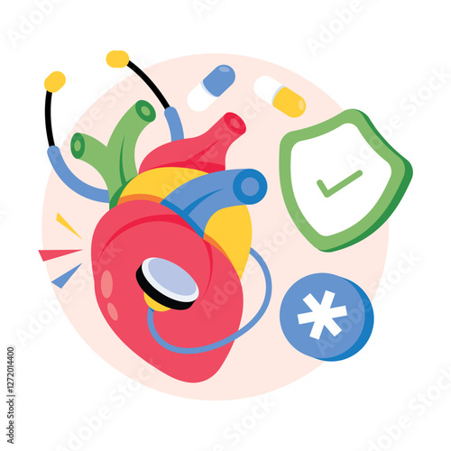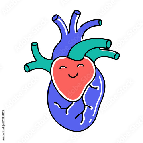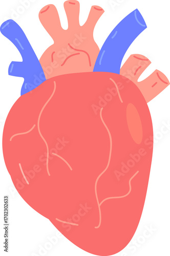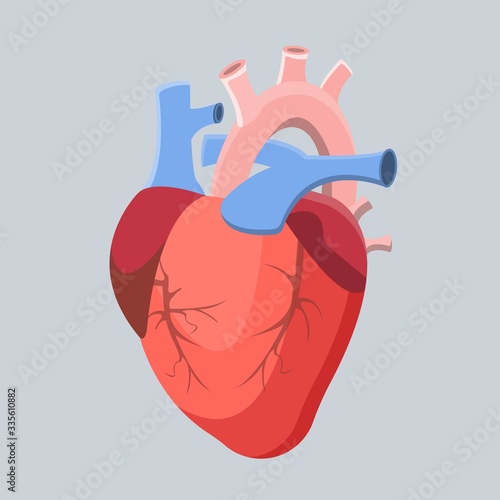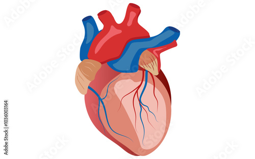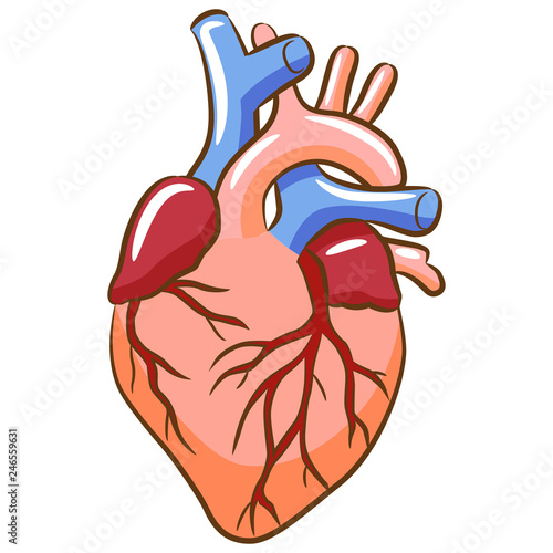 Вектор человеческого сердца. Медицинская анатомия органов с изображением значков коронарных артерий, вен и аорты, изолированных на белом фоне.