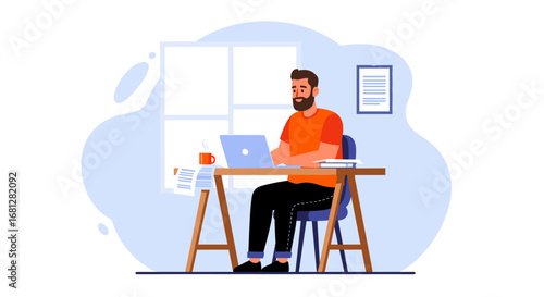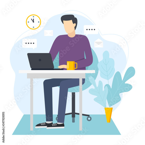 Голодный человек, сидящий за столом ресторана, ест пиццу, хот-дог, бургер, пьет газировку, плоская векторная иллюстрация. Жирная нездоровая пища, нездоровое питание. Переедание и ожирение. Зависимость от фастфуда. Дурная привычка