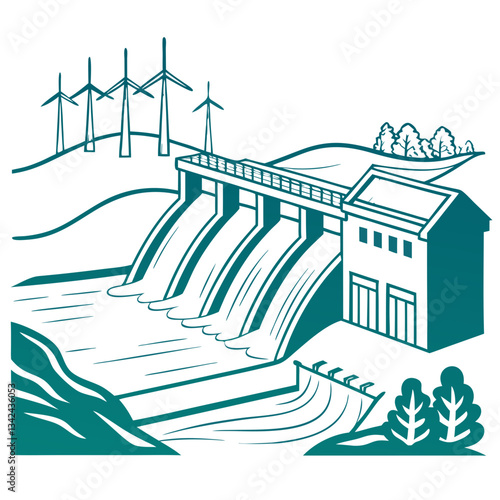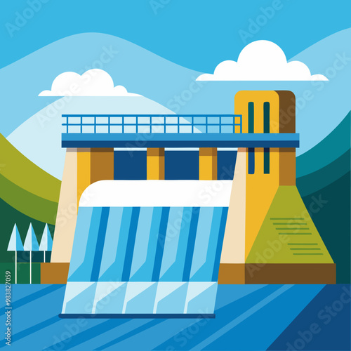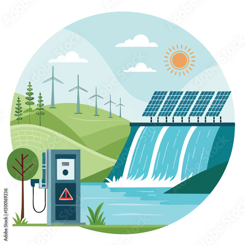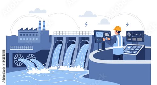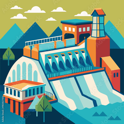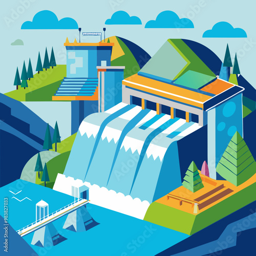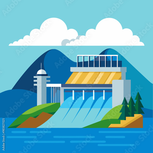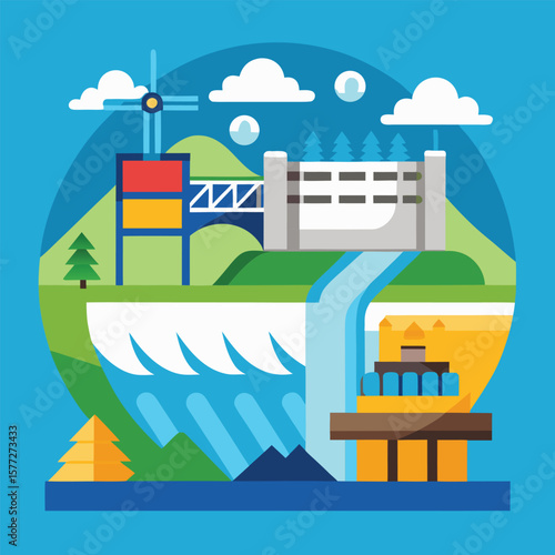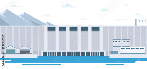 Гидроэлектростанция и завод. Промышленная концепция гидроэнергетики. Векторная иллюстрация в плоском стиле. Фон гидроэлектростанции. Возобновляемые источники энергии.